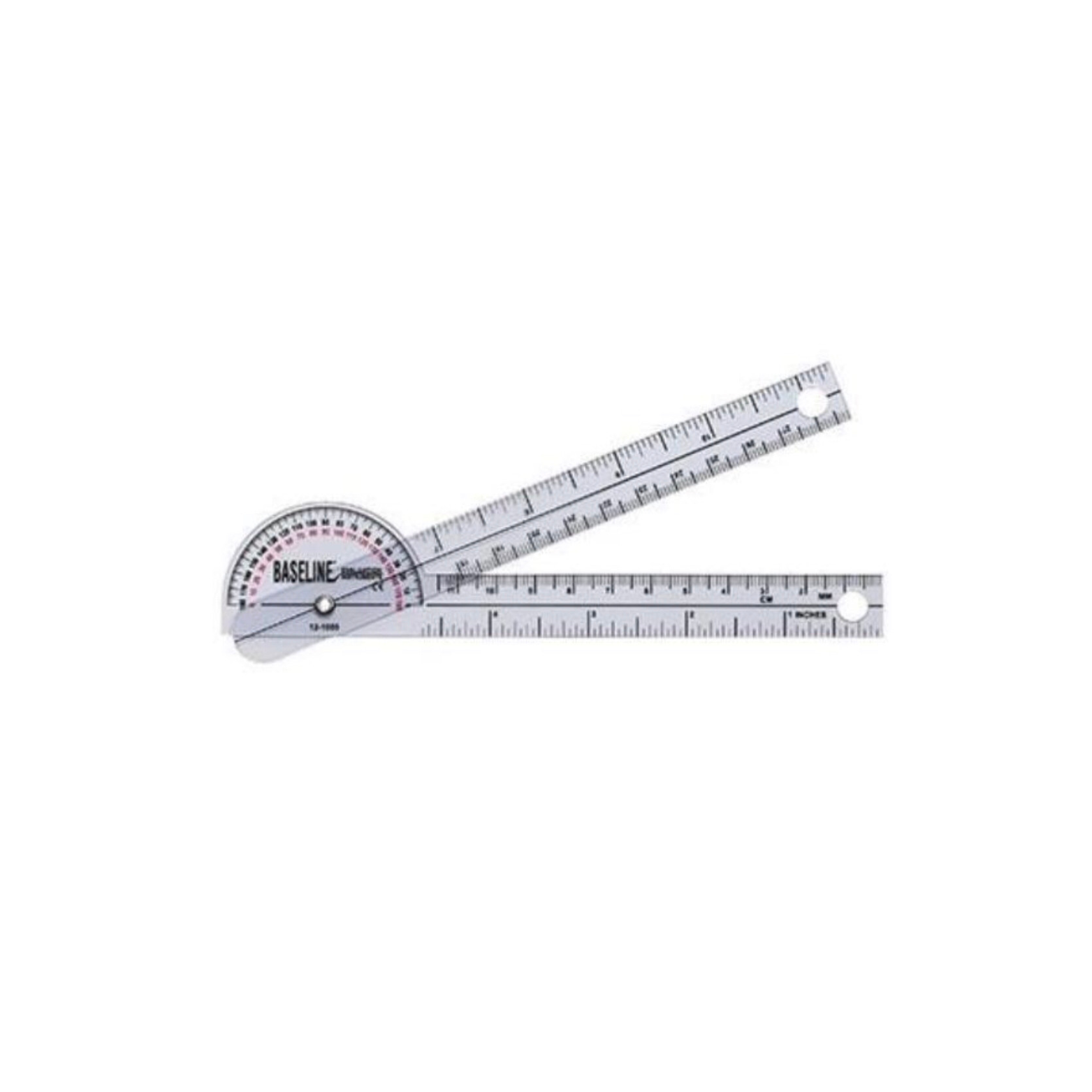 This transparent plastic goniometer permits observation of a joint's axis of motion and its range of motion. The 180° head has three scales calibrated to be used with the ISOM (International Standards of Measurement, STFR) system. The 180° angle scale reads 1° increments. The arms are 6 inches long. The arms have a linear scale in both inches and centimeters. They also will remain at the last measurement position until reset.