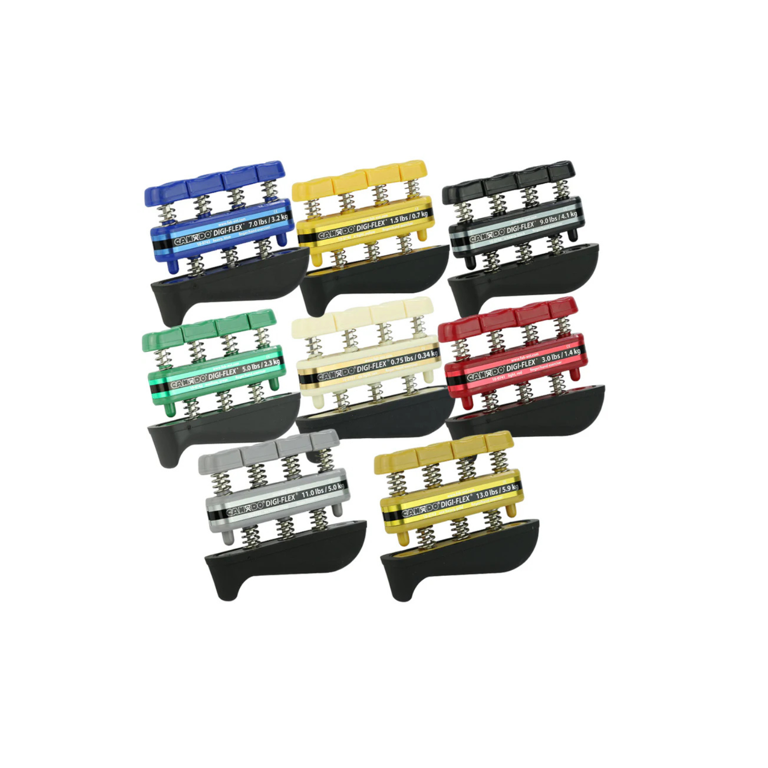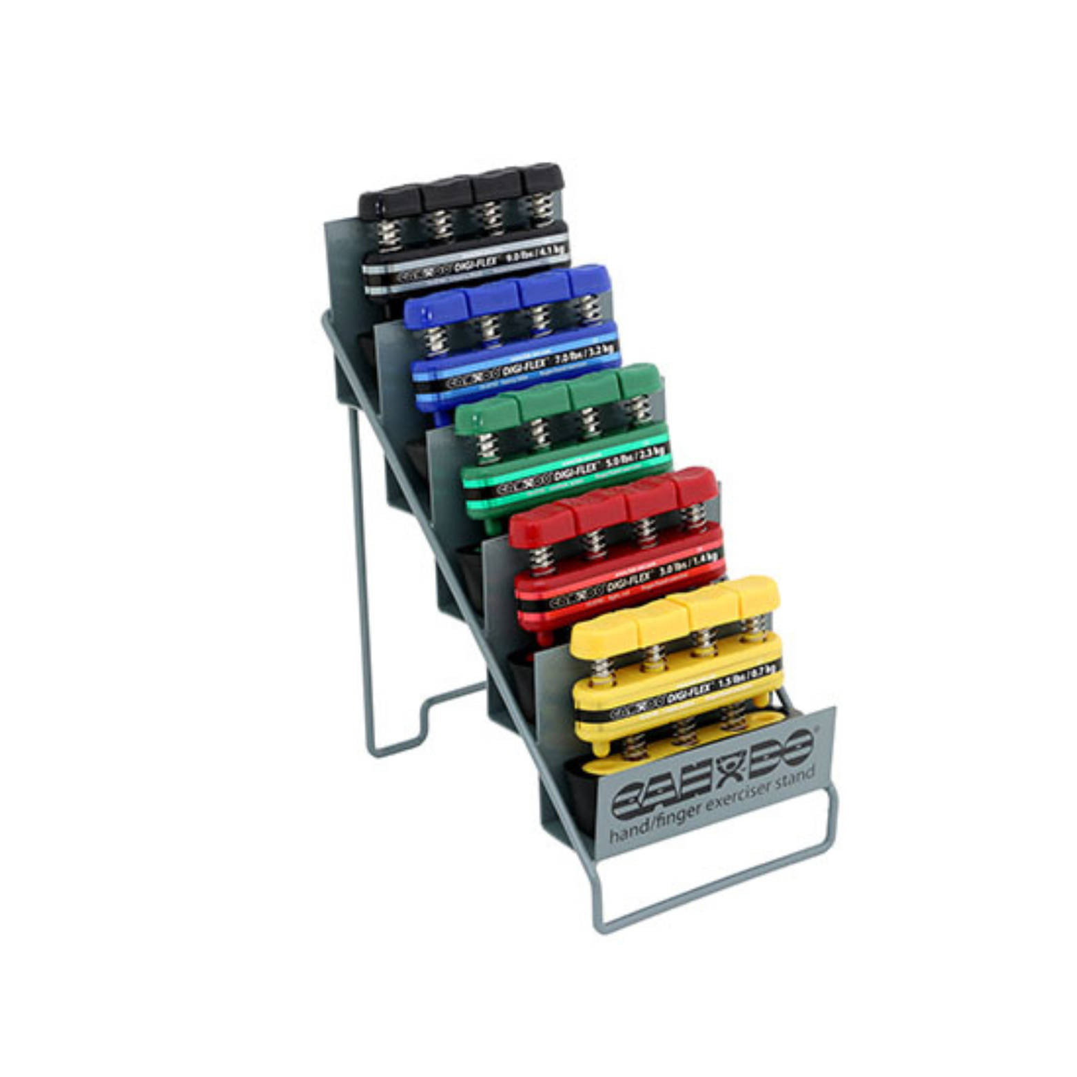 Progressive color-coded finger exercise tool helps develop isolated finger strength, flexibility and coordination. Use each button independently to exercise fingers or compress the entire unit for complete hand and forearm strengthening.
