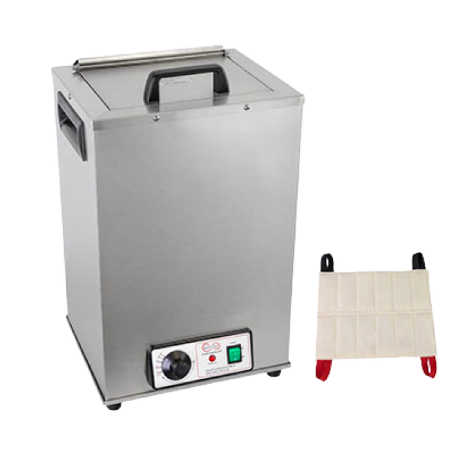 A stationary, compact stainless-steel unit that heats up to 4 moist heat packs to 160°F in an insulated water bath. Moist heat provides deep tissue relief for acute/chronic pain, soreness, and post-injury or post-workout recovery. Features adjustable temperature, glowing indicators, reusable packs, and easy cleaning. Ideal for home or clinic use; each pack provides ~30 minutes of therapeutic heat. Comes with 4 standard packs, removable plug set, and user manual.