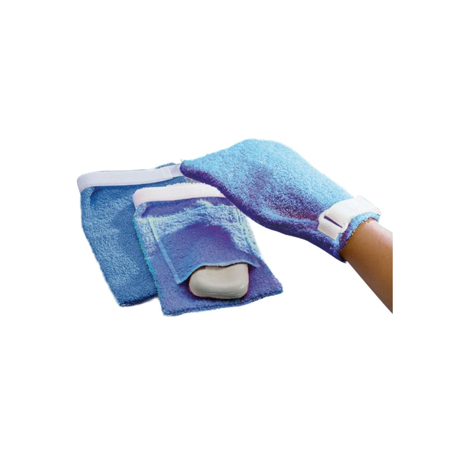 Mitts are made from long-wearing blue terry cloth. The mitt with pocket holds a bath size bar of soap. Mitt is available in blue.